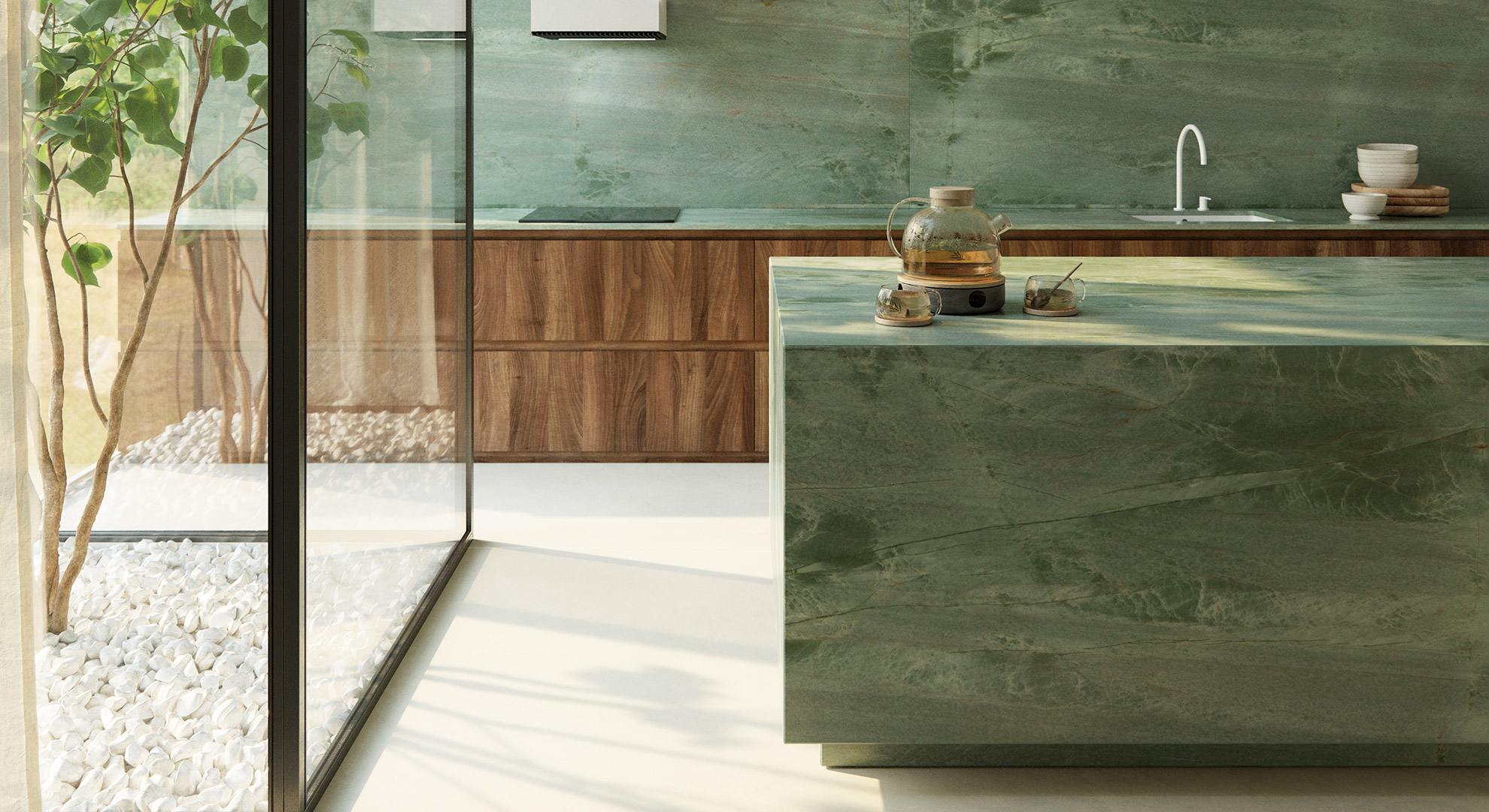 This natural quartzite, also known as Verde Esmeralda, features white veining and sandy tones, set against a greenish background reminiscent of a rolling sea. A truly captivating stone.