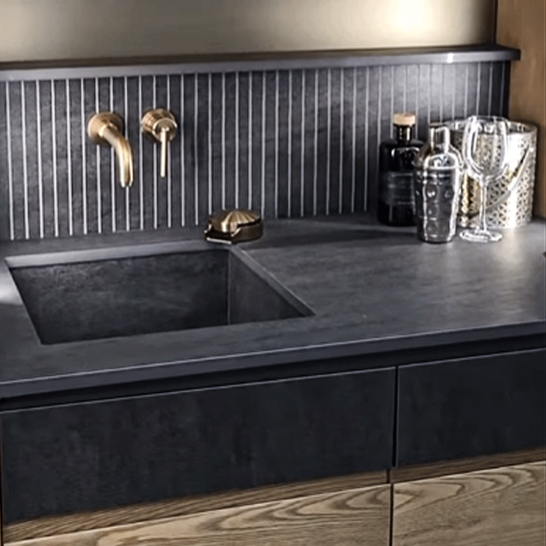 Coin café en Dekton Bromo avec comptoir, évier construit, tablette et dosseret avec texture Ukiyo (fabrication & installation Granit Design).